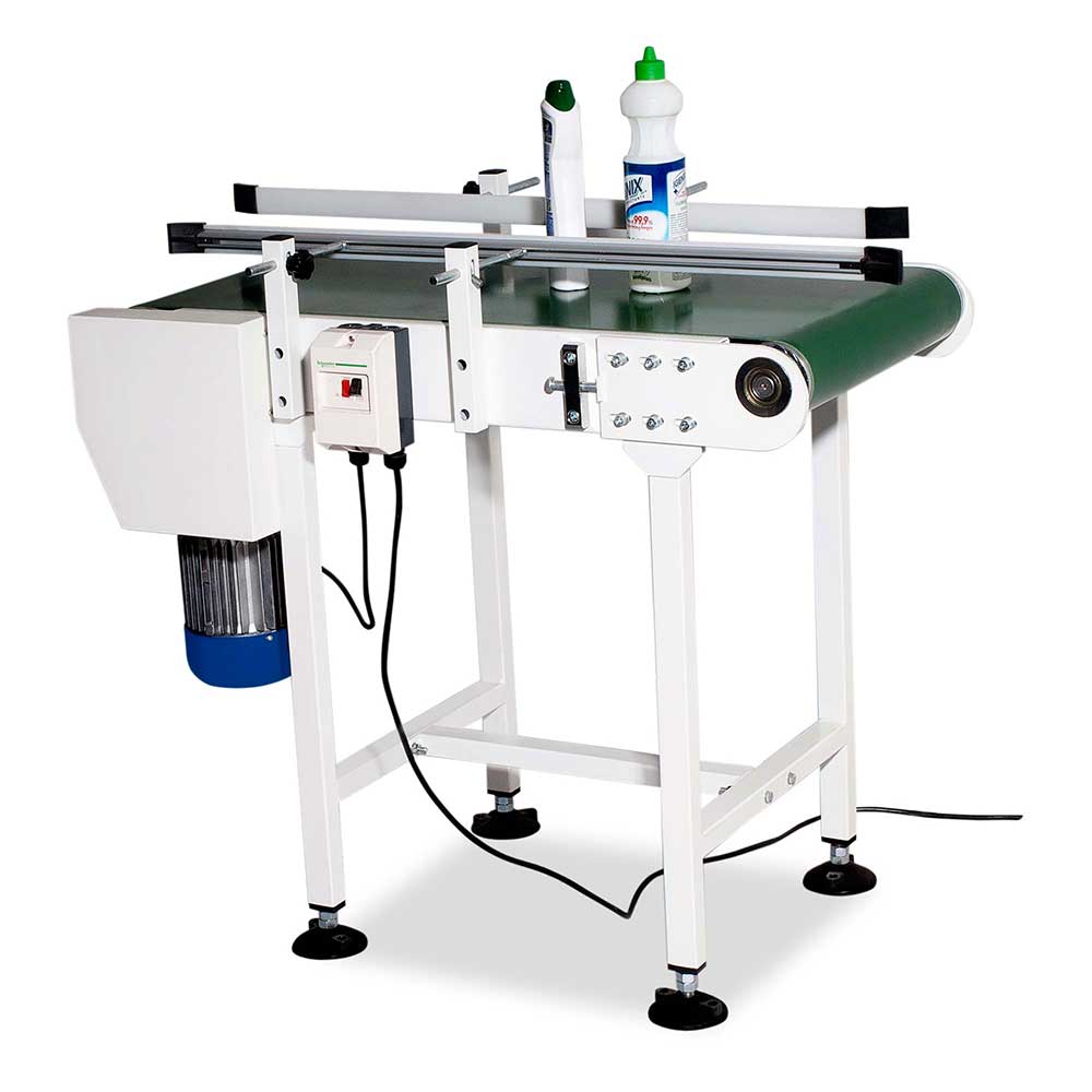 Cinta motorizada de 1000 mm de largo x 450 mm de ancho. Con un motor de 220V, 90W, con velocidad ajustable. Se conecta, alimenta y sincroniza con las selladoras automáticas para poliolefina.